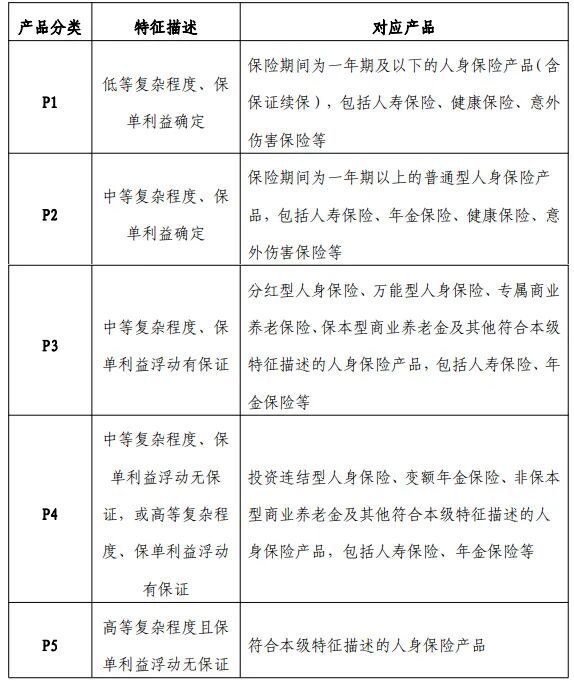 《自律规范》将人身险产品划分为P1、P2、P3、P4、P5 五类,复杂程度从低到高;财产保险产品划分为 P1、P2 二类。